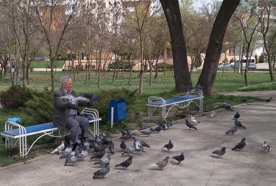 Мужчина кормит голубей на набережной Тирасполя.