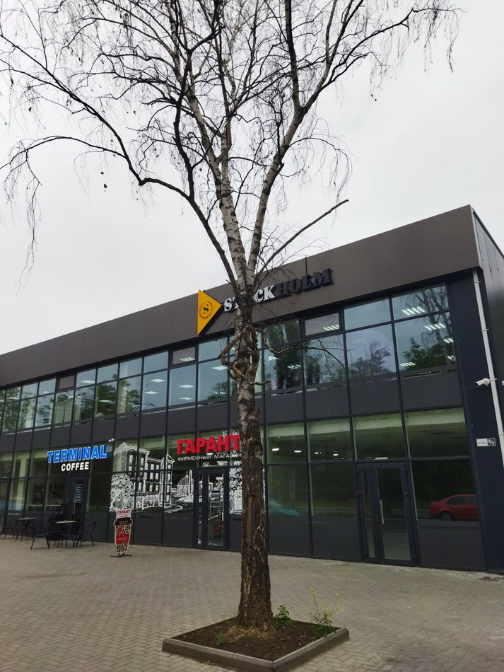 Ул. Правды. При строительстве здания повредили кору дерева. В итоге дерево высохло.