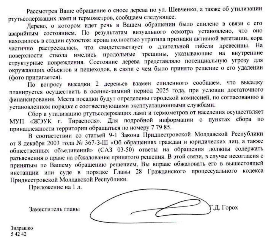 1.По улице Шевченко в районе церкви было спилено дерево 10.04.2024. Просьба предоставить информацию о причинах спила, а так же где именно будут высажены 2 дерева в замен спиленных. 2.Так же просьба предоставить информацию о пунктах приема ртутных градусников и ртутных ламп в городе Тирасполь. Вложение 30356 Ответ госадминистрации Тирасполя. Вложение 30357 Вложение 30358 Постановление Правительства ПМРР об обязательном компенсационном озеленении - высаживать 2 дерева вместо одного спиленного будет выполнятся при наличии финансирования? Из положительного - спилили усыхающее дерево, стали делать фото, но не публикуют ничего на сайте госадминистрации. |
