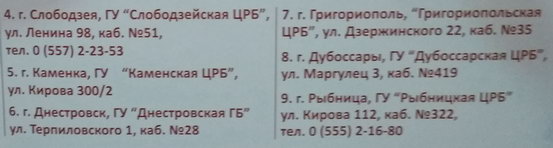 Получить консультации можно в кабинете инфекционных заболеваний центральной поликлиники г. Бендеры, ул. С.Лазо, 20, кабинет № 16; тел. 22294. Центр - СПИД г. Тирасполь, ул. Мира, 33; тел. 0533-29489. |