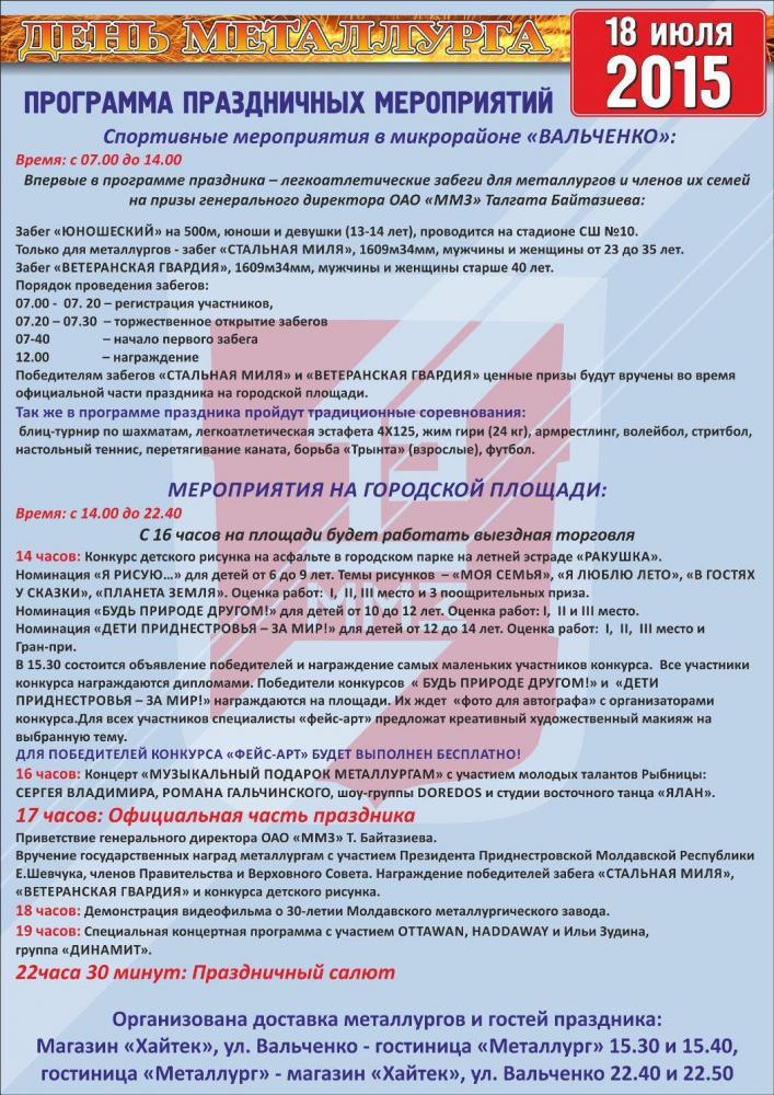 День металлурга 18 июля 2015 года - программа праздничных мероприятий