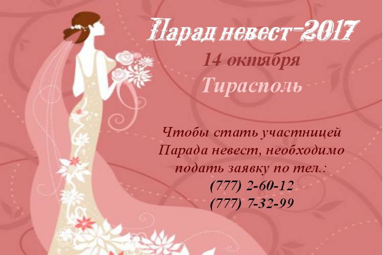 Запись по телефонам: (0777) 2-60-12, (0 777) 7-32-99. Вы можете стать такой невестой, какой позволяет ваша фантазия. Главное условие — вы должны быть в свадебном платье, в вечернем или особом наряде в свадебном стиле. Когда каждая из участниц пройдет фотосессию, мы все вместе начнем готовиться к шествию! Мы создадим колонну из невест и их подружек и отправимся на парад по улицам Тирасполя в сопровождении множества фото- и видеокамер и СМИ. Вложение 23246 |