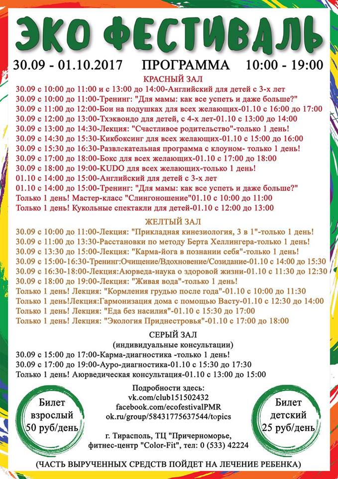 г.Тирасполь, ТЦ "Причерноморье", ул.Юности 6, Фитнес-центр "Color-fit" ЭКО фестиваль - это бережная взаимосвязь между людьми и окружающей их средой, будь то естественное или человеческое. ЭКО фестиваль - соединение и изучение человеческого опыта с ЭКОкрасотой, ЭКОтворчеством, ЭКОздоровьем, ЭКОблаготворительностью, ЭКОобщением, ЭКОпитанием. Входной билет на ЭКО фестиваль: 50 рублей/взрослый 25 рублей/детский. За эту сумму можно посетить ЛЮБОЙ ( их более сорока, на любой вкус) мастер-класс, причем столько - сколько успеете за 1 день (с 10:00 до 19:00). Не успеете посетить всё за 1 день? По многочисленным просьбам мы делаем ВТОРОЙ день (цена та же: 50 рублей/взрослый и 25 рублей/детский)! Отдельная оплата будет только за индивидуальную работу (консультации/массаж/творческие мастерские). Часть вырученных средств пойдут на БЛАГОТВОРИТЕЛЬНОСТЬ - целевое лечение ребенка. Вложение 23255 Вложение 23256 Вложение 23257 Вложение 23258 |