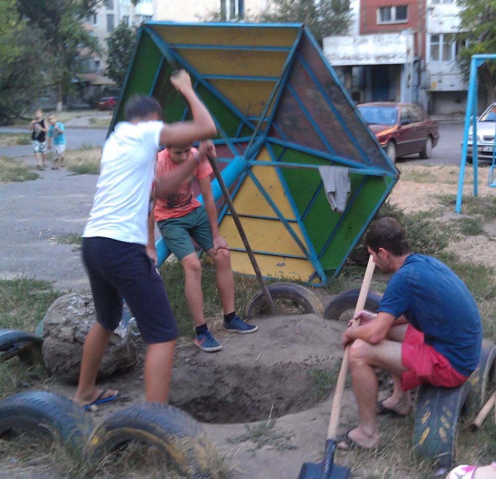 Товарищ Игорь - страна должна знать хоть имена своих героев купил песка и цемента, привез воды, лопату, мастерок, а я взял совковую лопату. Сломанный грибок до начала операции пролежал так с годик. Вложение 16589 Чуть подустав сам работать с ломом я привлек местную молодежь к упражнению на трицепс. Вложение 16590 Сделали прямо на асфальте бетон - замешав песок с цементом и потом смешав с водой. Вложение 16591 Залили бетон + камни на стоящий грибок, погруженный примерно на метр, закопали землей. Грибок готов! Вложение 16592 |
