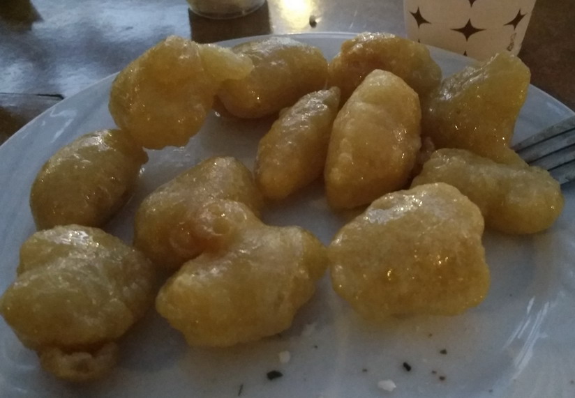 Какое то сладкое блюдо. Обжаренное тесто и внутри сладкий сироп вроде.