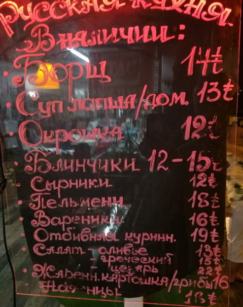 Вложение 26778Вложение 26779 Для тех кто соскучился по русской кухне - тоже есть еда )) Курс валют, примерно 5,8 лир = 1 доллар. Вложение 26780 |