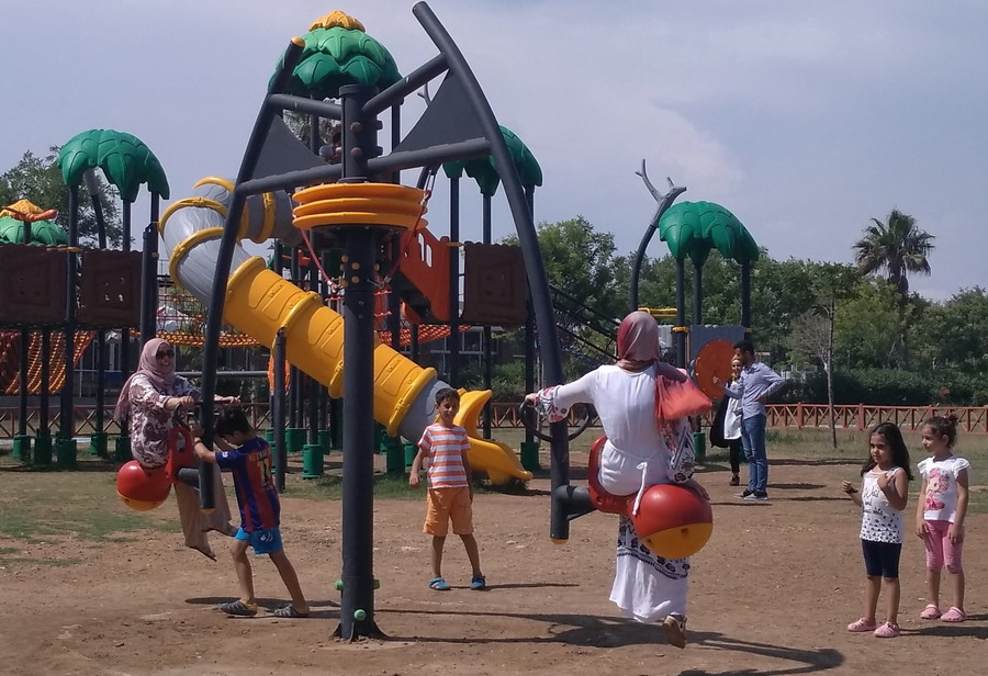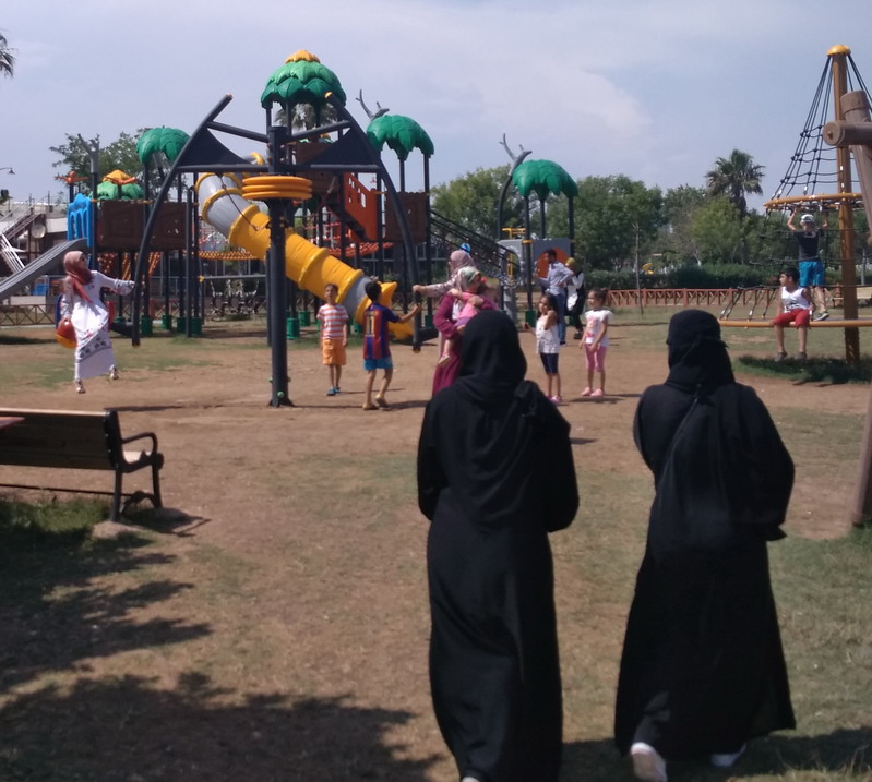 Турецкие женщины (мусульманки) отдыхают и катаются на аттракционах в парандже.