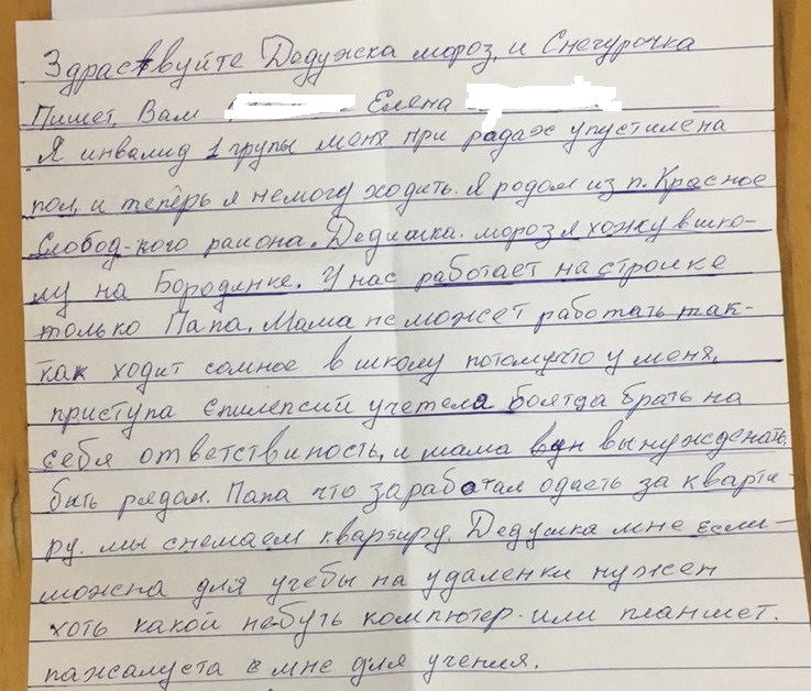 Елена, инвалид 1 группы - при родах уронили на пол, не может ходить. Приступы эпилепсии. Учится в школе на Бородинке. Мама не работает - ухаживает за дочкой. Папа работает на стройке. Квартира съемная. Просит компьютер или планшет для онлайн обучения. Вложение 27900
