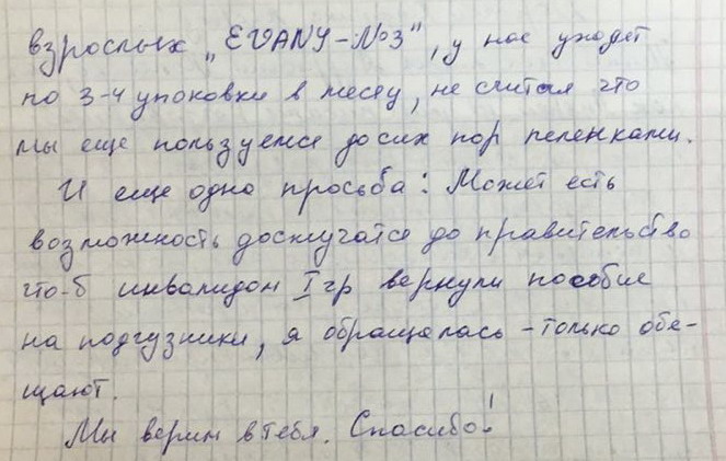 Андрею 19 лет, не умеет писать, разговаривать, ходить, лежачий инвалид детства. Просят подгузники. Вложение 27901Вложение 27902