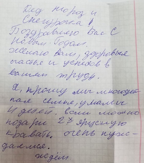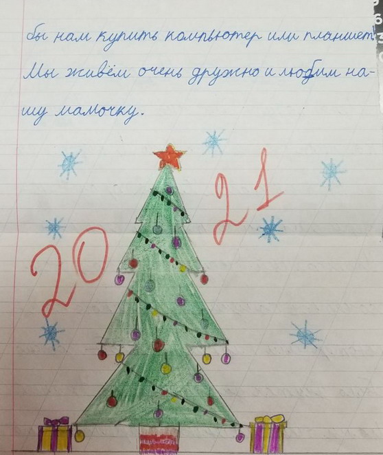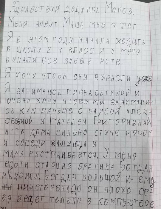 1.Амиль 7 лет, просит пижаму с рисунками и капюшоном 2.Ливай - сертификат на 10 посещений бассейна, лего, велосипед, гирлянду на окно. Папа не видит. 3. Милан 9 лет Здравствуй волшебный Дед Мороз. Это письмо я пишу для тебя. Я очень хочу чтобы всё что я написал для тебя сбылось. Я хочу чтобы Ливай поскорее поправился и играл как раньше. Я хочу чтоб Папа стал видеть, а мама стала доброй. Так же я хочу для Гокки ошейник желтого цвета и красный поводок. Гокки -это моя собака породы Хаски. Ему 2 месяца, он смешной игривый и ласковый пес. Я думаю что в Новый год ты исполнишь желания всех. Я хочу отучиться на программиста и помочь папе, чтоб к нему вернулось зрение. С любовь Милан. А ещё дай Леваю новые ( не понимаю это слово)), а Амилю собственный телефон. Они хорошо вели себя в этом году и запрашивают всё это. Это мои братья. Вложение 27923Вложение 27924