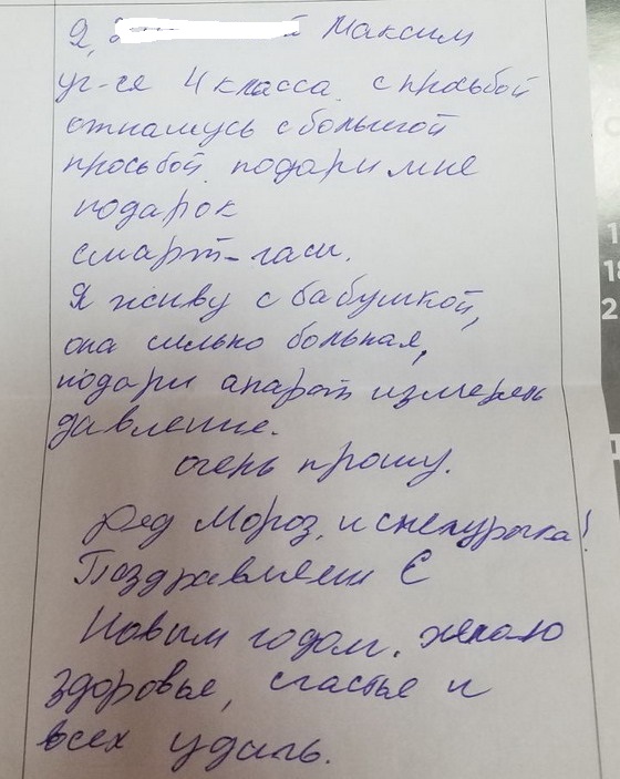 Максим учиться в 4 классе, живет с бабушкой. Просит бабушке - Аппарат для Измерения давления. Себе - смарт-часы. Вложение 27911
