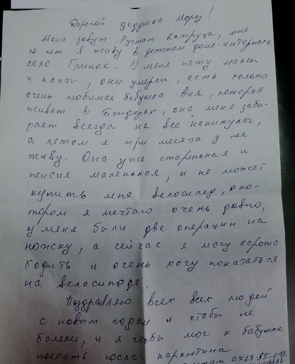Рустаму 12 лет, живет в детдоме в с. Глиное, мама и папа умерли, есть любимая бабушка Аня из Бендер. С бабушкой Рустам проводит каникулы. Мечтает о велосипеде. Вложение 27912