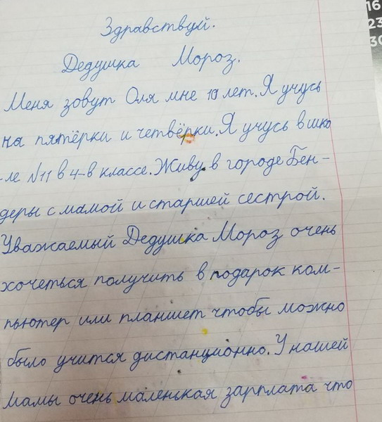Кто хочет помочь - дети будут рады. Вложение 27864 Номер карты для сбора денег для подарков детям 9104016993239757 Чувальская Любовь. В Тирасполе подарки можно принести на центральную почту, сфоткать и отдать работнику почты Юлии - 77835295. Вложение 27909 Если кто-то хочет почувствовать себя в роли "Деда Мороза" и подарить подарок ребенку из крайне неблагополучной семьи (родители-инвалиды, дети-инвалиды, неполные семьи где родитель живет на зарплату 1000р, отсутствие родителей и опекунство бабушек-дедушек), то это можно сделать! Для участия достаточно прочитать что-то из писем, выбрать одного ребенка, отписаться в комментарии о выборе, купить/найти подарок и отнести на центральную почту. Дети просят абсолютно разные вещи начиная от б/у компьютеров, смартфонов, планшетов, продолжая игрушками, школьными принадлежностями и заканчивая продуктами и дровами. |