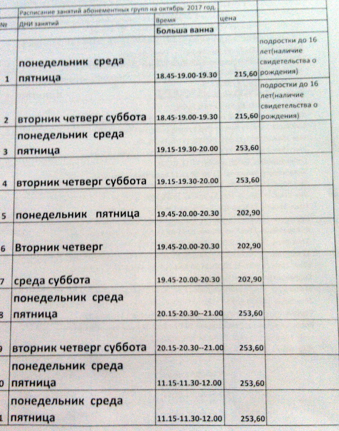 Расписание тираспольского городского бассейна на 2017-2018 год.