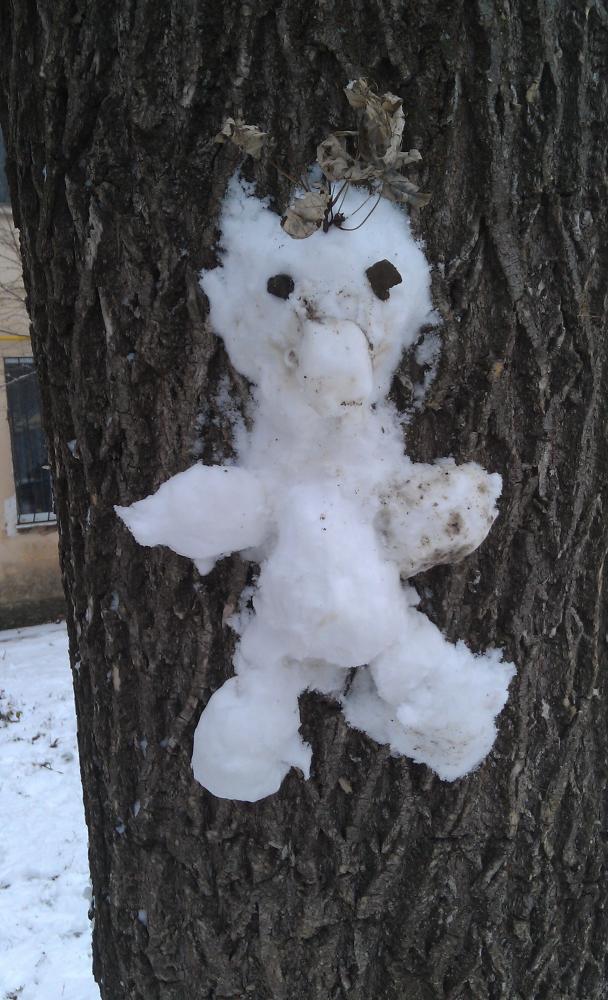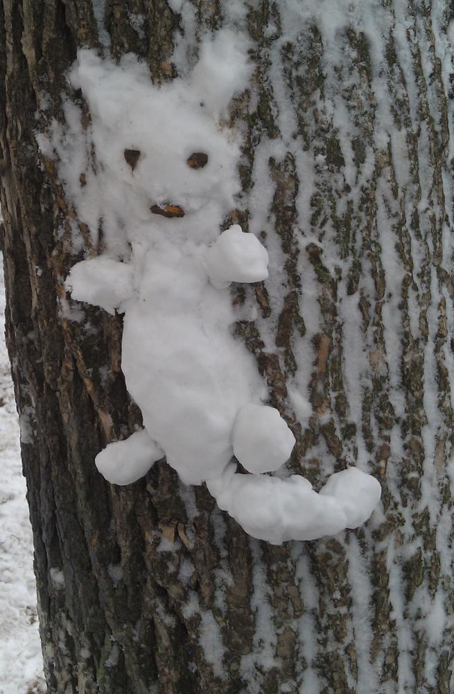 Лепим снежных кошек на деревьях. На втором фото у кота большой хвост.