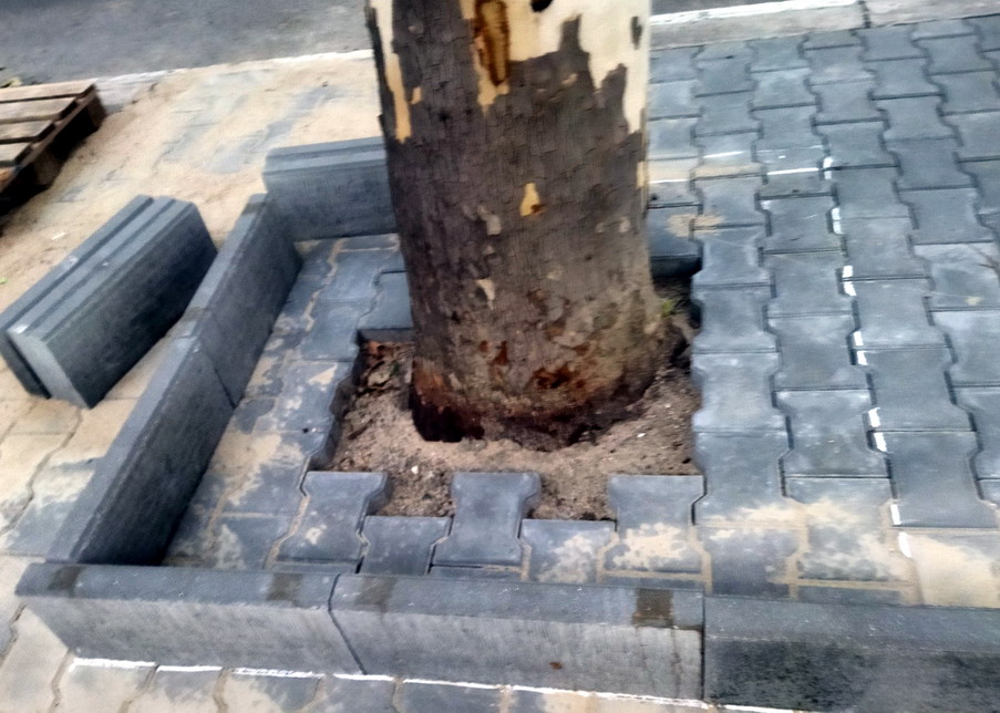 Тирасполь. ул. Ленина.. Плитка впритык к стволу дерева. Почему не оставлено хоть пол метра земли? А потом дерево умирает и падает... Деревьям нужна и вода и воздух для дыхания корней. На фото и видно, что цемент прямо к дереву подступает… А это - смерть дереву.
