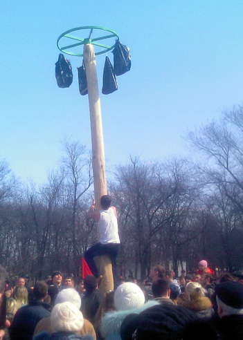 Столб - гладкое дерево. Раньше столб обливали водой, и бывал минус при этом. Как залезть на ледяной столб? |