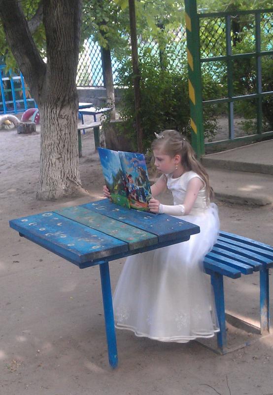 Выпускной в садике - маленькая принцесса увлеченно читает книжку, а может там фото деток с садика?