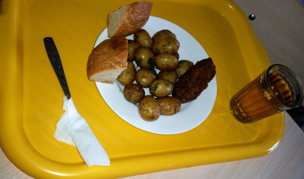 Картошка и котлета стоили по 8р. Рыба (хек) 14-16 руб. (в зависимости от размера) Гречка - 4 рубля/порция (можно брать пол порции) Надо было сфоткать меню. + есть кран с водой и мылом! - нет туалета. |