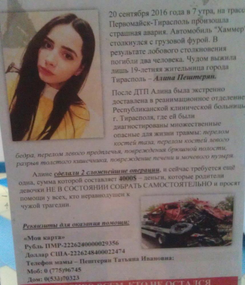 Алина Пештерян попала в аварию. Срочно нужна операция .