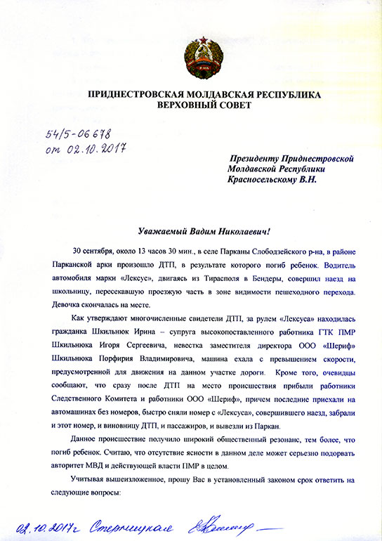 Приднестровье маленькое. Все всех знают. И поэтому уже быстро разобрались что там произошло. Спасибо VIGO за оперативно выложенные ссылки. Посмотрим как будут развиваться события. С сайте Change.org "Примерно в 13.30, 30 сентября 2017 года на трассе Тирасполь-Бендеры , у арки села Парканы, была сбита 15-летняя девушка,воспитанница Парканской школы-интернат, НАСМЕРТЬ. Водитель Лексуса, совершивший наезд на ребенка, скрылся с места ДТП на приехавших машинах. По полученным данным за рулем Лексуса, который сбил девочку в Парканах, была Шкильнюк Ирина. Жена начальника отдела таможни по контрабанде и невестка депутата ВС и первого зама гендиректора ООО Шериф Шкильнюка. Информация получена со слов людей, которые знают машину, которые знают,что хозяйка эта Ирина, и от людей, которые видели ее на месте дтп с ее подругами. Просим Власти Приднестровской Молдавской Республики не спускать все просто так с рук водителю!!!!!!! Пусть виновник аварии отвечает перед законом, как и все люди!!!!!!!! Перед законом должны быть все равны! !!!!!" |