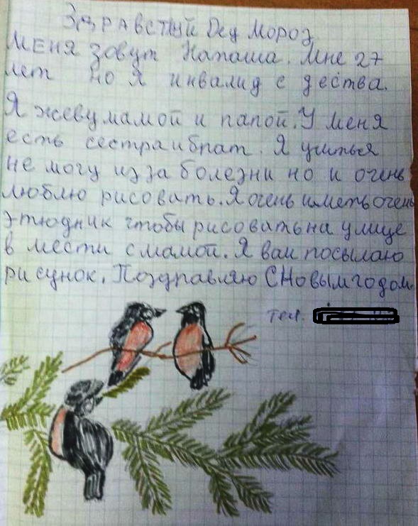 Учиться на отлично в украинской школе. Чтобы Дед Мороз не болел, а то у детей пропадет вся радость. Счастья Деду Морозу и крепкой любви со Снегурочкой! Девочка сделала новогодние игрушки своими руками, ходила в кружок "очумелые ручки". Любит зиму и зимние развлечения. "Как у Вас со зрением, Дедушка Мороз? Я постараюсь писать по разборчивее." Мечтает о ноутбуке, он ей нужен для школы, чтобы не ездить далеко в библиотеку и тартить деньги на дорогу. Вложение 23759Вложение 23760 Будет рада любому подарку. Младшему братику (3 годика) просит - 3-х колесный велосипед, т.к. старая коляска сломалась уже. Мама носит ребенка на руках, а ей нельзя - у неё одна почка. Маме тяжело работать, а пенсии нет. Работы у мамы нет, мамам ищет работу. С работой сложно - т.к. надо забирать младшего братика с садика. Ест отчим, который не хочет помогать в этом. Отчим издевается над детьми. Мама обратилась в милицию и в организацию по насилию в семье - предоставили жильё и очень помогают. Мама говорит - чудеса бывают. Спасибо людям, которые творят добро и помогают другим людям! Которые поддержат в трудную минуту. Мечтает переехать в свою квартиру - которая требует ремонта, в ней нет воды. Папа - инвалид 2 группы и платит алименты 240 рублей. А девочке нужны деньги на школу, на питание, учебники ... Братику - надо за садик платить. Маме очень тяжело одной, маме 33 года. Родственников нет. Вложение 23761Вложение 23762 Еще девочка мечтает увидеть брата мамы, который затерлся на бескрайних просторах России в тайге. Девочка верит с чудо и сказку в нашей жизни. Желает здоровья маме. Вложение 23764 Рисунки Лилии и ангелочки с бумаги. Вложение 23765Вложение 23766Вложение 23767 |