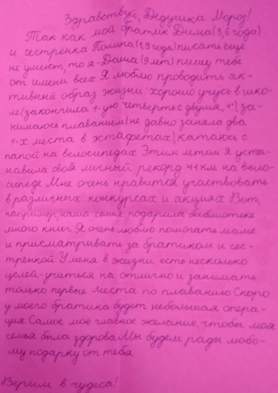 Даше 9 лет. У нее есть младшие сестричка и братик. Даша занимается плаванием, участвует в акциях, хочет чтобы ее семья была здорова.