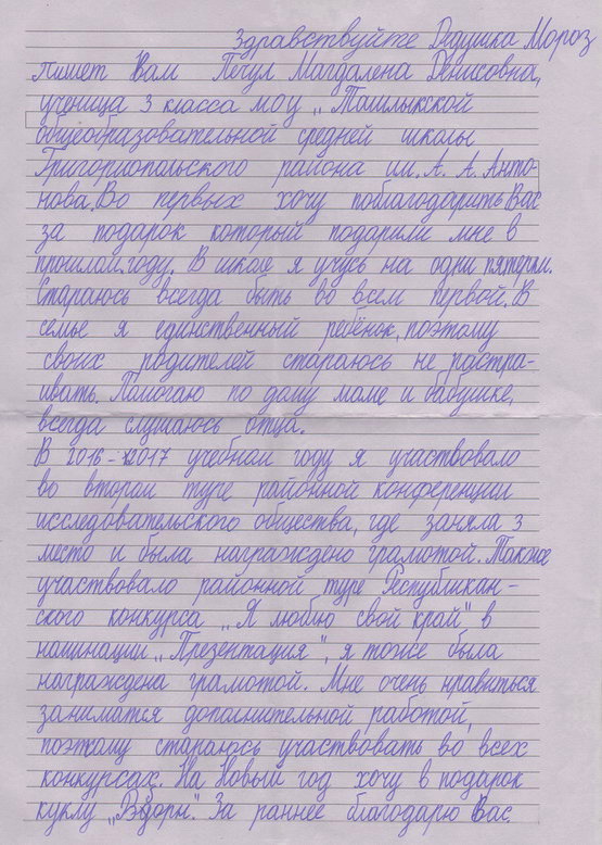 Даниела поздравляет всех с новым годом! Перевод: Добрый день, Дед Мороз! Меня зовут Даниела, мне 11 лет и учусь в 5-м классе. В этом году я была послушной девочкой, учусь хорошо, помогаю родителям, дедушкам и бабушкам. У меня еще есть брат, его зовут Денис, он еще маленький, ему три с половиной годика. Но уже верит в Деда Мороза, он желает много игрушек, но я знаю, что невозможно, я бы хотела, чтобы Вы выполнили одно мое желание, что поздравить брата с Новым Годом машиной или трактором, а мне, если можно, красивый браслет и конфеты. Мы будем ждать тебя и в следующем году. Дед Мороз. С большим уважением и любовью Балан Диниела. До свидания. Вложение 23837Вложение 23838 |