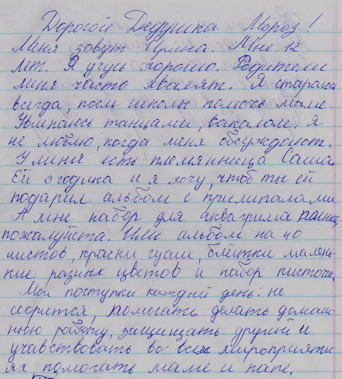 Перевод письма: Добрый день, Дед Мороз! Меня зовут Эвелина, мне 6 лет. Посещаю детский сад , я послушная. Люблю танцевать, петь, бегать, играться с детьми. Хотела бы получить в подарок медицинский набор, так как хочу стать врачом, альбом и ручки для рисования. До свидания. Вложение 23856 |