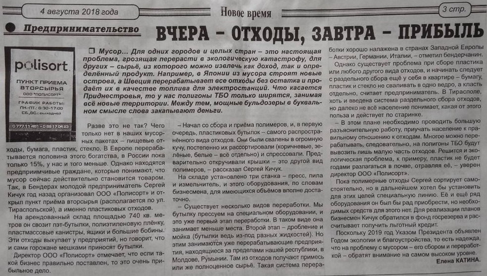 На днях в бендерской газете "Новое Время" вышла статья про Полисорт, Sergey Kichuk.