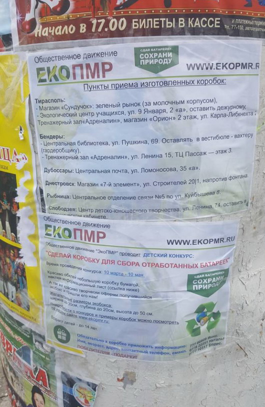 Информация о конкурсе коробок для сбора батареек возле дома народного творчества и ремесел по улице Шевченко, на остановке Правда в Тирасполе.