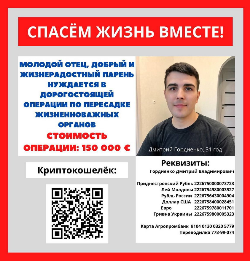 К сожалению, Дима всего этого лишён. Сейчас даже привычные для любого из нас действия, такие как - приём пищи, ходьба, общение – даются ему с великим трудом. Дмитрию нужна срочная помощь! С рождения Дима привык бороться с трудностями. У него врождённый порок сердца. В 2003-м и 2010-м годах парень перенёс две операции для восстановления деятельности сердечно-сосудистой системы, включающие протезирование сердечного клапана. Исправно принимая поддерживающее лечение, молодой человек работал инженером в энергетике, создал семью и подарил жизнь дочери. Однако в 2020 году здоровье Димы резко ухудшилось. Коварный covid-19 усугубил и без того критическую ситуацию и отобрал возможность работать. Летом 2022 года по результатам обследования в клинике Кишинёва выяснилось, что к проблемам с сердцем прибавились проблемы и с дыхательной системой. Врачи поставили неутешительный диагноз, и для сохранения жизни рекомендовали Дмитрию пересадку сердца и лёгких. На фоне неутешительного диагноза: коррегированная транспозиция магистральных сосудов (состояние после протезирования ТК, пластики ДМЖП и аннулопластики МК (2003-2010)), выявлены осложнения: мерцательная аритмия персистирующая и пароксизмальная тахисистолическая форма. Сложнейшую хирургическую операцию готовы провести немецкие трансплантологи. Цена операции 150 000 €. Для сохранения жизни, Диме, как воздух, нужна наша финансовая помощь! Вложение 28770 |