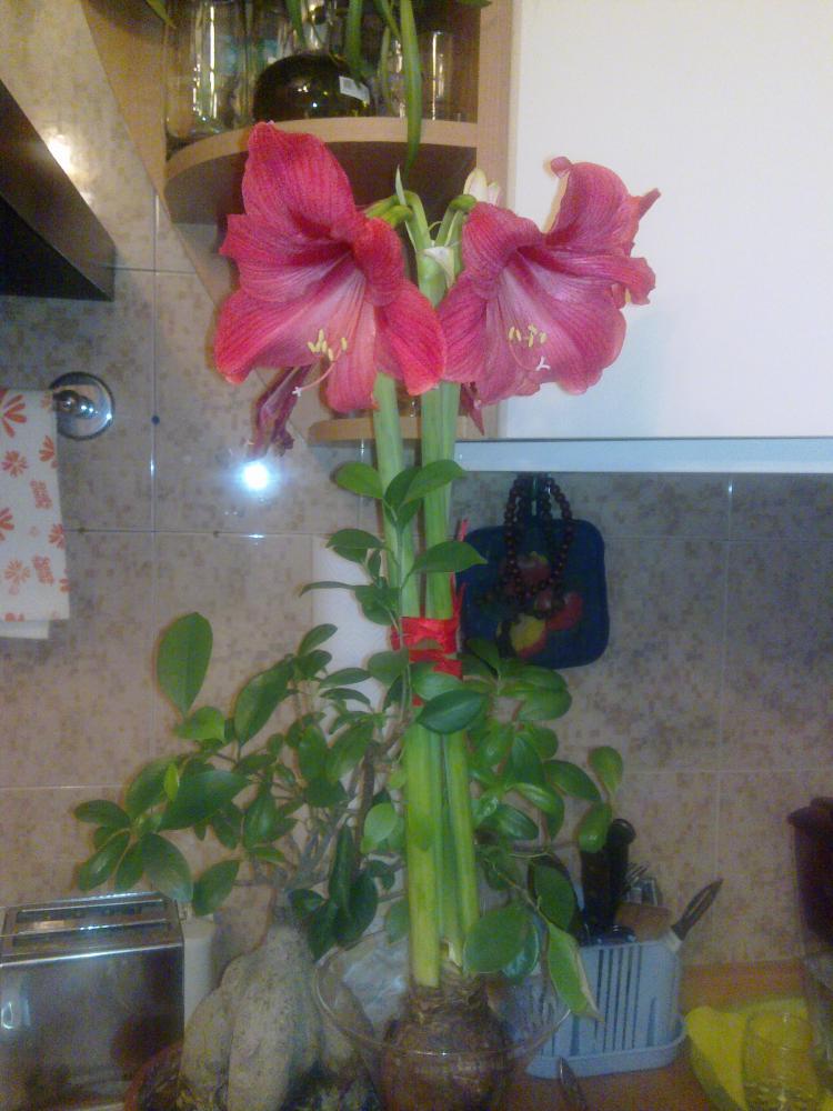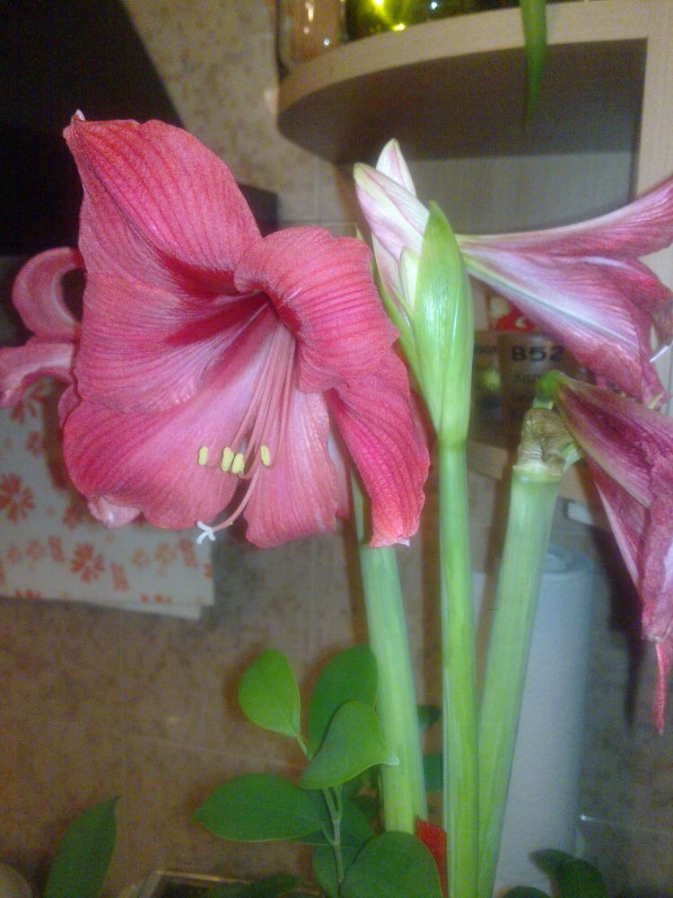 Прежде всего, это обширное семейство гибридных форм гиппеаструмов. Цветут гиппеаструмы крупными воронковидными цветами красной, оранжевой, розовой расцветки с полосами. Гиппеаструмы не пахнут, количество цветов у них меньше, чем у амариллиса.