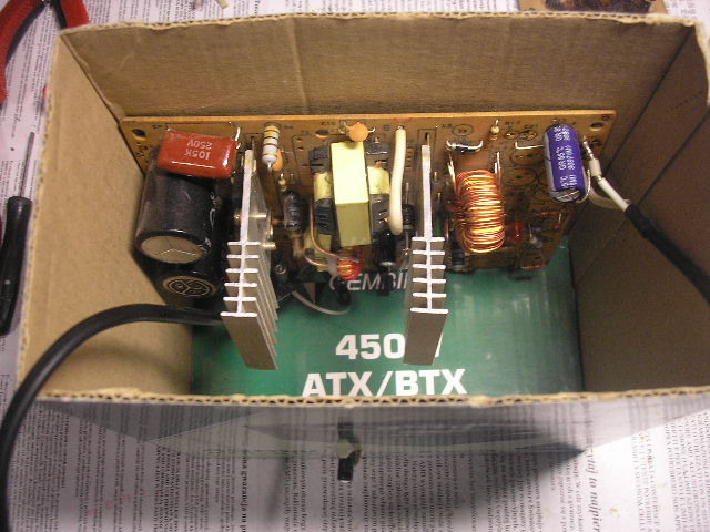 Ремонтировал ноут ТОШНИБА. Дефект , умерший адаптер. С виду ничего сложного. Ну где утром, в воскресенье найдешь адаптер для ТОШНИБЫ. Нашел старый АТешный блок, доработал до нужных напряжений и мощностей. Подключил. Дабы ничего не замкнуть, не уронить, сей ХЕНД-МЭЙД, положил в коробку. ОТремонтировал плату, собрал ноут. Включил. Ноут поругался на батарею, дату время, неверный чек сум и запустился. ТЕстить особенно времени не было, запустил фильм. Через мин 20, из коробки вспышка молнии и хлопок. Отстрелил взорвавшийся конденсатор.