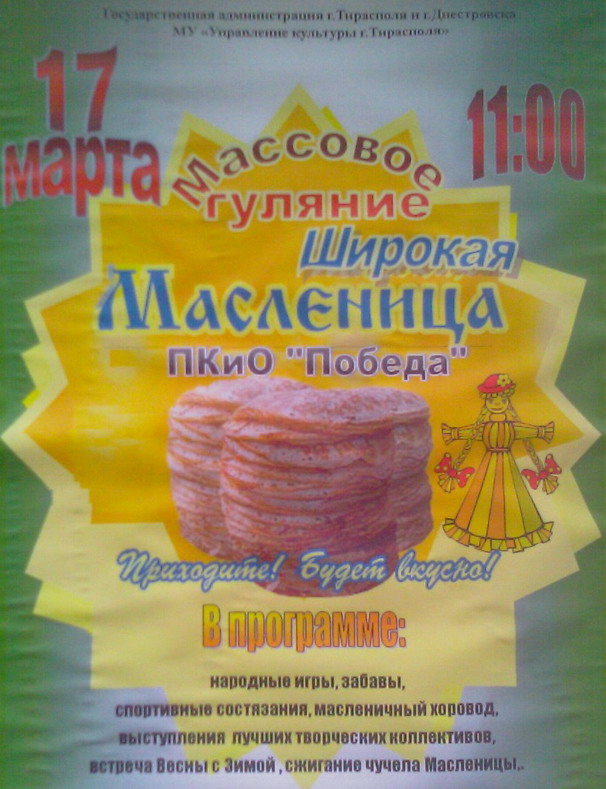 Масленица в Тирасполе будет отмечаться 17 марта в 11 часов в парке Победа.