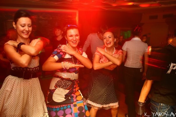 ниже - стиляги, в том числе танцующие макарену) а потом - вечеринка "старые люди", где мы с одной подругой пришли в кроличьих ушках сопровождать нашего друга "Хью Хеффнера" )
