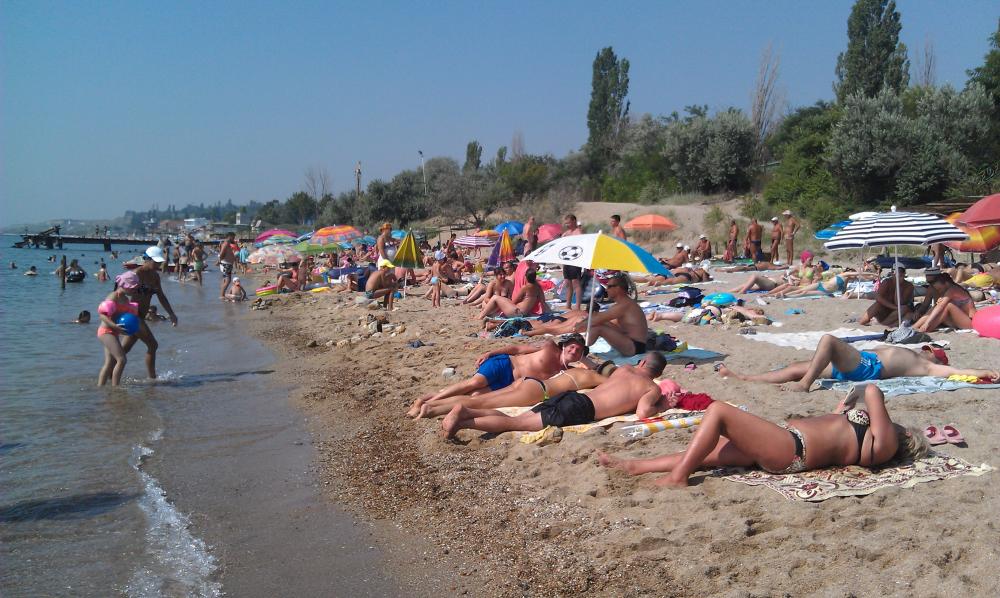 И пошли мы на пляж у нашего причала и "курень". Людей довольно много, сам пляж чистый, на море люди катаются на парусниках.