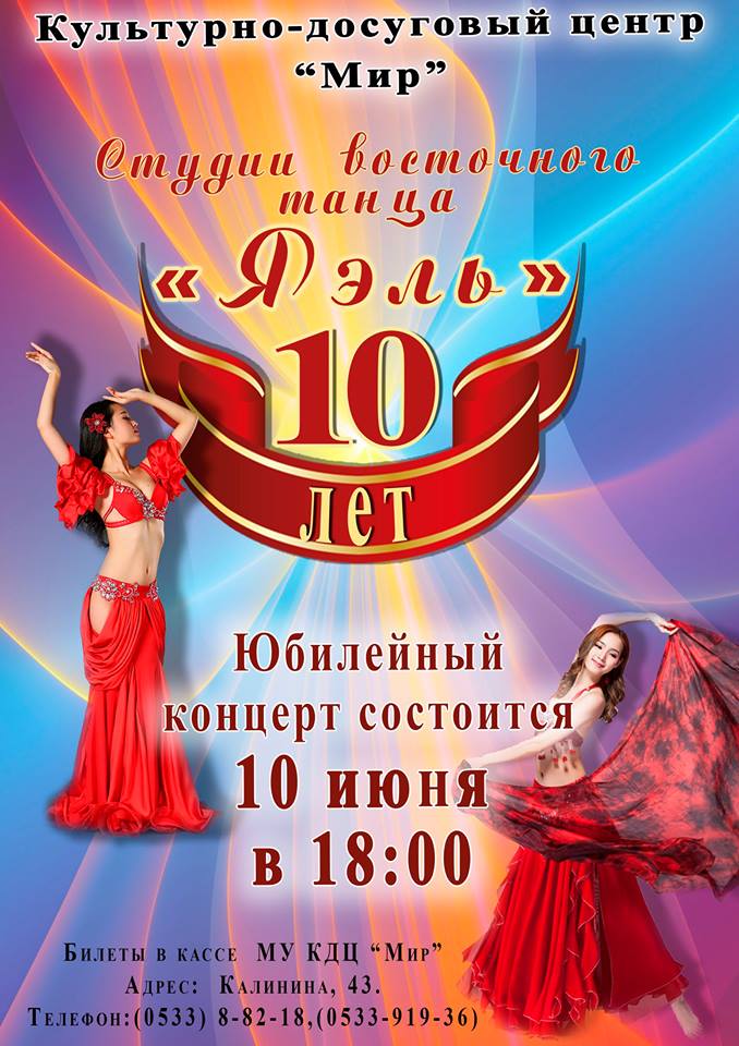 Студия восточного танца "Яэль" приглашает гостей на концерт, который состоится 10 июня (суббота) в 18:00, в МУ "Мир", г.Тирасполь. |