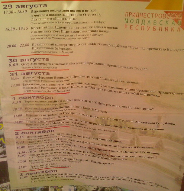 Программа празднования 21-ой годовщины со дня образования Приднестровской Молдавской Республики. Сделал просто фото. В тексте не нашел.