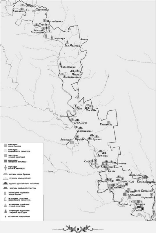 АРХЕОЛОГИЧЕСКИЕ ПАМЯТНИКИ ЭПОХИ БРОНЗЫ И РАННЕГО ЖЕЛЕЗНОГО ВЕКА В ПРИДНЕСТРОВЬЕ С наступлением эпохи бронзы (конец III — начало II тыс. до н. э.) значительные перемены произошли в жизни племен, населявших степные пространства Причерноморья. Усиленно стало развиваться скотоводство. Ведению скотоводческого хозяйства немало способствовали климатические изменения в Северном Причерноморье во II тысячелетии до н. э. Уже с конца энеолитического времени климат становится постепенно все более сухим, что приводит к увеличению пространства степей, а значит, расширяет возможности развития скотоводства. Скотоводческое хозяйство требовало гораздо меньше затрат труда, в то же время оно давало большое количество различных продуктов: мясо, жир, молоко, сыр, масло, кожу, шерсть. Некоторые земледельческие племена переходят к скотоводству как более продуктивному хозяйству. Оно выделяется как самостоятельная отрасль хозяйства, и появляются чисто скотоводческие кочевые племена. Использование лошади для передвижения и особенно в военном деле существенно изменило его. Теперь стали возможны дальние военные походы, которые в короткое время обогащали завоевателей. Жизненный уровень этих племен значительно поднялся. В конечном счете пастушеские племена выделяются в особую группу. Это является первым крупным общественным разделением труда. Очень важным производственным достижением населения Приднестровских земель в эпоху бронзы было окончательное широкое внедрение орудий труда, оружия и других изделий из бронзы, отличавшейся легкоплавкостью, прочностью, красотой, что способствовало новому значительному сдвигу в хозяйстве. Бронзовые орудия труда способствовали дальнейшему повышению производительности труда, появлению прибавочного продукта, развитию на его основе обмена. С ростом производительных сил происходили изменения в общественных отношениях. Мужской труд в металлургии, кочевом скотоводстве, военном деле занял ведущее место. В результате на смену господствовавшему ранее матриархальному строю приходит патриархат. Нарастает имущественное неравенство. Ни один предыдущий период в первобытной истории Приднестровья не характеризуется таким количеством культур, как этой, ямная, катакомбная, многоваликовой керамики, сабатиновская, белозерская. Ямная и катакомбная культуры получили свои названия по наиболее характерным для них типам погребений. Погребения данных культур так же, как и погребения многоваликовой культуры, названной по характерному для нее типу керамической посуды, встречается практически во всех районах Приднестровья. Памятники сабатиновской культуры ( названа по первому раскопанному памятнику у с. Сабатиновка, Николаевской области Украины) открыты в южной части Приднестровья (у сел Ново-Котовск, Терновка). Памятники белозерской культуры на территории Приднестровья встречаются редко и представлены курганными захоронениями, открытыми на первой надпойменной террасе Днестра у сел Глинное, Парканы, Суклея (Слободзейский район), Погребя (Дубоссарский район). Появление железа знаменует собой подлинную революцию в технике и хозяйстве населения края. Переход к металлургии железа в этом регионе произошел в IX—VII вв. до н. э. Только с появлением орудий труда из железа стало возможным развитие пашенного земледелия, 