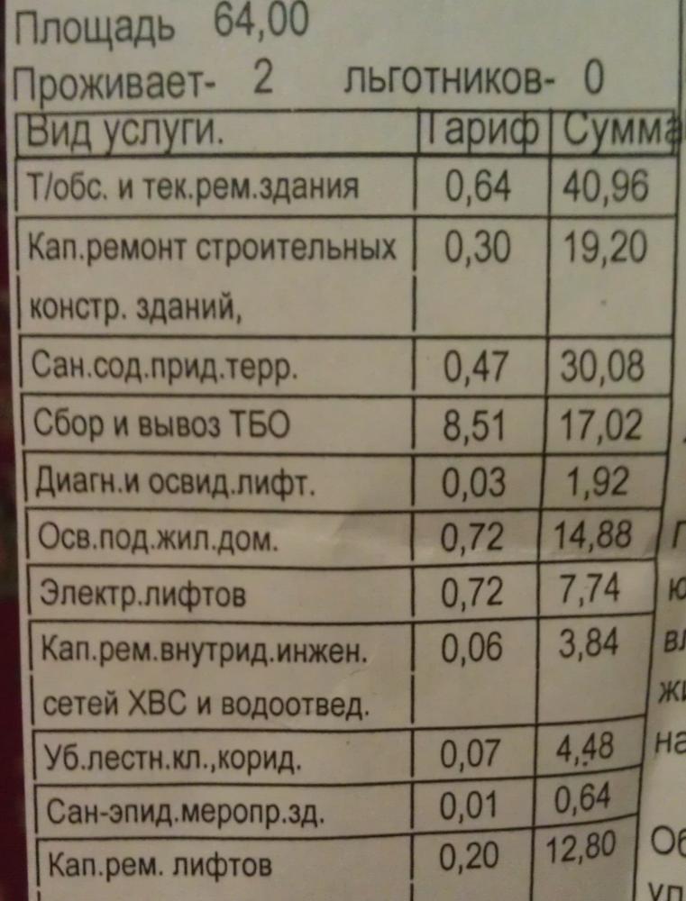 На счет коммунальных услуг. Вот моя последняя квитанция. Санитарное содержание придорожной территории - 30 р, это зарплата дворникам? Тех. обслуживание и тек. ремонт здания, кап. ремонт строительных конструкций зданий - 60р. Эти деньги куда тратятся? |