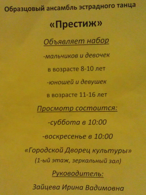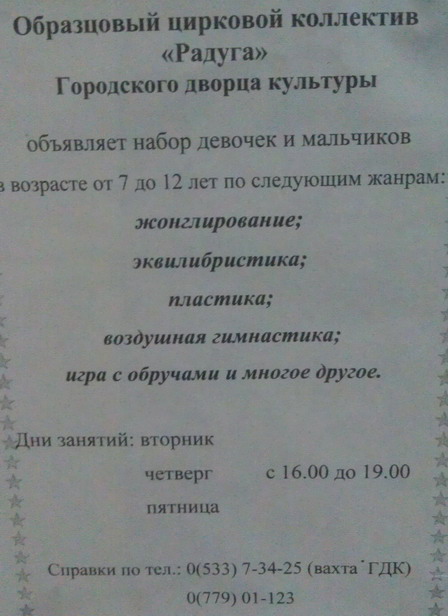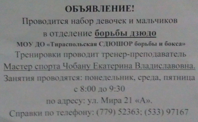 Какие есть секции на центральном стадионе? На счет секций для детей - вот объявления в школе: Объявление - Тирасполь. Дзюдо. Проводиться набор девочек и мальчиков в отделение борьбы дзюдо МОУ ДО "Тираспольская СДЮШОР борьбы и бокса". Тренировки проводит тренер-преподаватель мастер спорта Чобану Екатерина Владиславовна. Занятия проводятся: понедельник, среда, пятница с 8,00 до 9,30 по адресу ул. Мира 21 "А". Справки по телефону 779 52363, 533 97167. Образцовый цирковой коллектив "Радуга" Городского дворца культуры объявляет набор девочек и мальчиков в возрасте от 7 до 12 лет по следующим жанрам: - жонглирование - эквилибристика - пластика - воздушная гимнастика - игра с обручами Дни занятий: вторник, четверг, пятница с 16.00 до 19.00 Справки по телефонам: 0533 73425 (вахта ГДК), 0779 01123 Образцовый ансамбль эстрадного танца "Престиж" в Тирасполе объявляет набор - мальчиков и девочек в возрасте 8-10 лет - юношей и девушек в возрасте 11-16 лет. Просмотры в субботу и воскресенье в 10.00 в "Городской Дворец Культуры", 1 этаж, зеркальный зал. Руководитель - Зайцева Ирина Вадимовна. Гимнастика и акробатика в Тирасполе. tirassport.org/index.php/podvedomstvennye-uchrezhdeniya/spetsializirovannaya-detsko-yunosheskaya-shkola-olimpijskogo-rezerva-4mou-do-sdyushor-gimnastiki-i-akrobatiki Бокс, вольная борьба, греко-римская борьба, дзюдо, самбо, кикбоксинг в Тирасполе. tirassport.org/index.php/podvedomstvennye-uchrezhdeniya/spetsializirovannaya-detsko-yunosheskaya-shkola-olimpijskogo-rezerva-borby-i-boksa |