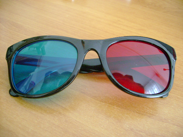 стерео очки. это не просто одно красное. другое синее, это электронное устройство с питанием и прочей хренью, но это так к слову. к ним еще нужен 3д монитор или телевизор и на нем еще должна быть соответствующая трансляция, игра и т.д.. |