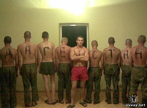 - Все, пиз...ц! Даги победили... Не добившись прояснения ситуации от официальных представителей военной части, где происходило побоище, корреспондент Комсомолки разыскал «неофициальных» информаторов. Вот рассказ одного из них: «За день до этой драки были мелкие столкновения дагестанцев и русских разведчиков-срочников в местном клубе. Затем те и другие «забили стрелку» на следующий день на плацу, в 8 вечера. Но даги повели себя нечестно: они напали огромной толпой на шестерых разведчиков еще днем. И понеслась. Разведчики заметили, что "наших бьют", - кто успел, тот выбежал на помощь. Тем не менее дагов было больше, и они, конечно, замесили наших ребят. Затем на плац выехал командир бригады и пустил очередь из «калаша». На этом все и закончилось. Итог: 10 человек в больничку, нескольких дагестанцев отправили на гауптвахту. Затем в течение недели-двух и русских и кавказцев гоняли на марш-броски и всячески наказывали. Сейчас в Кантемировской дивизии собираются организовать отдельную роту ребят со спортивными разрядами, которые будут хоть как-то контролировать горячих южан». Любопытно, что ЧП случилось несколько недель назад, но Минобороны молчит о нем, словно кислоты в рот набрало. Оказывается, всем командирам и начальникам Министерства обороны, а также Московского военного округа (МВО), в состав которого входит бригада, где случилось ЧП, строжайше приказано держать язык за зубами. Им более чем откровенно дали понять: проболтаетесь - не получите премии по итогам месяца и года. Кто же после этого будет выносить сор из избы? Таие ЧП случаются в тех частях, где Генштаб допускал большую концентрацию кавказцев во время призыва новобранцев. Такие перекосы в комплектовании подразделений уже приводили к тому, что в некоторых полках кавказцы «брали власть» в свои руки, игнорируя даже офицеров. Конечно, проблема не только в том, чтобы равномерно рассеять воинов-кавказцев по просторам Руси Великой, не позволяя им под крышами казарм сколачиваться в диктаторские «стаи». Здесь, безусловно, нужны и сильные пропагандисткие, воспитательные, психологические, уставные и даже, если хотите, «репрессивные» ходы в рамках закона. Но похоже, что слишком занятым бесконечными реформами военачальникам пока не до этого. Вот и приходится усмирять драчунов и «террористов» автоматной пальбой поверх голов. Нашлись среди дагестанцев и подражатели разошедшейся в интернете дембельской фотографии "Ингуш - сила". http://www.vvvay.net/news/massovuju_...2010-08-13-255