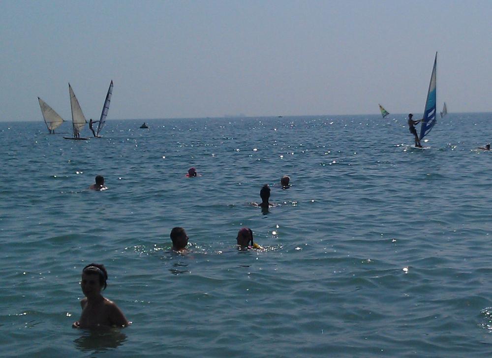 И пошли мы на пляж у нашего причала и "курень". Людей довольно много, сам пляж чистый, на море люди катаются на парусниках.