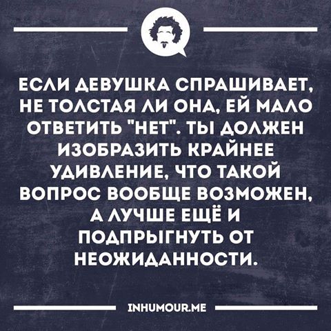 ![]() -------- Добавлено в 23:33 -------- Предыдущее было в 23:26 -------- Сорокалетний Коля познакомился с девушкой Машей. Девушке Маше тридцать пять лет и она весьма нехороша собой. Коля толст, лыс и очкаст. Сегодня Коля первый раз идет к Маше в гости. По дороге Коля заходит в магазин, чтобы купить шампанского и водки. У витрины с презервативами Коля останавливается в глубокой задумчивости. Богатый жизненный опыт подсказывает, что если он купит презервативы, то что-нибудь обязательно случится и секса не будет, а если не покупать презервативы, то Маша обязательно потащит его в постель, но без презервативов не даст. Коля впадает в кататонию. В это время Маша стоит перед зеркалом и решает - брить ноги или не брить. Богатый жизненный опыт подсказывает, что если она побреет ноги, то что-нибудь обязательно случится и секса не будет, а если ноги не брить, то все сложится замечательно и дело дойдет до интима, но девичья честь не позволит ей ложиться в постель с небритыми ногами. У Маши скисает мозг. Вопрос - как же все-таки этим двум уродам потрахаться? -------- Добавлено 11.04.2017 в 01:07 -------- Предыдущее было 10.04.2017 в 23:33 -------- ![]() Одиноким девушкам на заметку |
