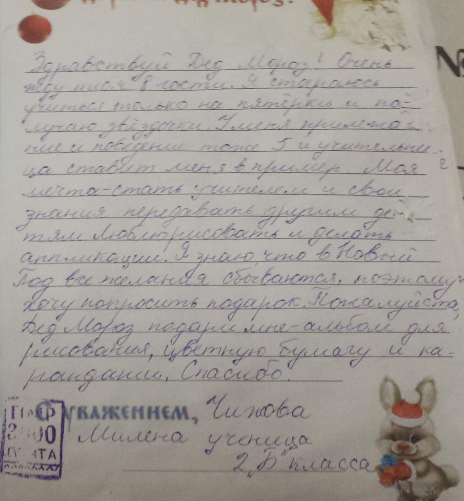 Письма Деду Морозу на Дубоссарскую почту. Адреса детей можно узнать по телефону 777-23981 (директор дубоссарской почты Юлия Чеснокова). Здравствуй Дедушка Мороз! Меня зовут Сережа. Я учусь в 4 классе, учусь дома. Я много месяцев не хожу в школу, болею. Учителя приходят домой. Мне скучно дома всё время, мама работает, а я один сижу. Я очень хочу большого конструктора лего. Очень люблю строить и еще хотелось робота, чтоб я мог днем играться. Спасибо! Сережа Здравствуй Дедушка Мороз. Меня звать Владимир, я у родителей инвалид. Но я очень люблю учиться, так как я слепой. Но я очень люблю Новый год. И очень люблю ездить на олимпиады. Чтобы обрадовать родителей. Прошу у Вас Дедушка Мороз подарить мне на Новый год от Вас на Ваше усмотрение. Дорогой Дед Мороз! Мне 8 лет. Я учусь в 3 классе. Я отличница. А еще я дружу со всеми одноклассниками, всегда им помогаю. Я инвалид детства. У меня больные руки. Скоро у меня день рождения - 21 декабря. Дорогой Дедушка Мороз, от всей души поздравляю тебя с Новым Годом! Желаю тебе много здоровья. Как и все дети, я тоже жду от тебя подарка. Подари мне, пожалуйста большой мяч-попрыгун и обруч для гимнастики. Жосан Яна. Пишет тебе Пакул Ваня. Мне 5 лет, но мне помогает писать письмо мой старший брат Саша. Я хожу в специальный садик в городе Дубосары "Центр реабилитации". Я люблю стихи. Еще я люблю играть с машинками и рыцарскими достпехами. Мой любимый Дедушка Мороз - подари мне на Новый Год здоровье и машинку. Я очень тебе буду благодарен за этот чудасный подарок. С уважением, Пакул Ваня!!! Здравствуй дорогой, добрый Дедушка Мороз. Пишет тебе Диана Еричина, ученица школы №7 г. Дубоссары. Хочу пожелать тебе в этом Новом Году много счастья, добра, успеха, удачи и снежной зимы. Чтобы твои сани по снежной дороге к нам детишкам ехали быстрее. В этом письме прошу не для себя, а моего младшего братишки инвалида, которому 3 года. Не мог бы ты подарить ему немного здоровья, и еще, пожалуйства, небольшой сюрприз, он мечтает о самокате. Потому что из еды ничего нельзя. Здравствуй Дед Мороз! Очень жду тебя в гости. Я стараюсь учиться только на пятерки и получаю звездочки. У меня прилежание и поведение тоже 5 и учительница ставит меня в пример. Моя мечта - стать учителем и свои знания передавать другим детям. Люблю рисовать и делать аппликации. Я знаю, что в Новый Год все пожелания сбываются, поэтому хочу попросить подарок. Пожалуйста, Дед Мороз подари мне альбом для рисования, зветную бумагу и карандаши, спасибо! Чижова Милена, ученица 2Б класса. |