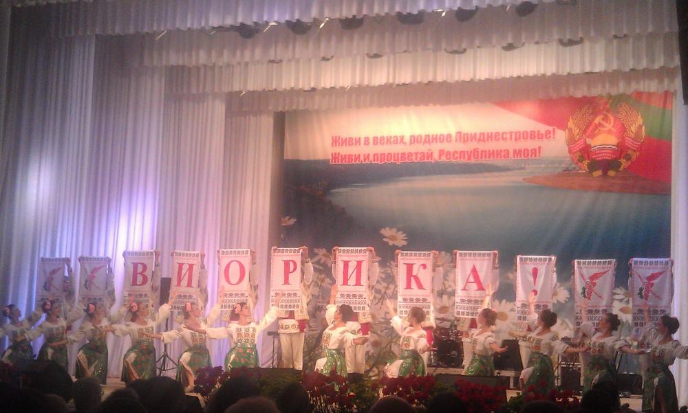 Предлагаю в данной теме делится всем интересным, что касается празднования юбилея ПМР - его 25-летия. Концерт во Дворце Республики 1 сентября. В 1-м фойе первого этажа ГКЦ «Дворец Республики» размещена выставка «Шаги истории», в музыкальном фойе - фотовыставка «Ровесники Республики». Сначала было торжественное собрание, посвященное 25-й годовщине со дня образования Приднестровской Молдавской Республики. В гости даже приехал депутат Государственной Думы Федерального Собрания Российской Федерации Роман Иванович Худяков. Сначала выступал Приднестровский Государственный ансамбль танца и народной музыки «Виорика» (Художественный руководитель Народный артист ПМР Александр Галацан, главный балетмейстер Заслуженный деятель искусств ПМР Игорь Чобану.). Исполняли танец «Хай ла хорэ». Приднестровский Государственный хор и сводный состав солистов – участников Республиканского конкурса «Турнир хоров Приднестровья» исполнили песню «Приднестровцы сердцем мы». Вот несколько видео с концерта: Приднестровский государственный хори Сводный состав лауреатов Республиканского конкурса «Турнир хоров Приднестровья». Главный хормейстер, Народная артистка ПМР Татьяна Твердохлеб, песня Соловьи не тревожьте солдат. youtu.be /watch?v=dvcdiEY2jwY