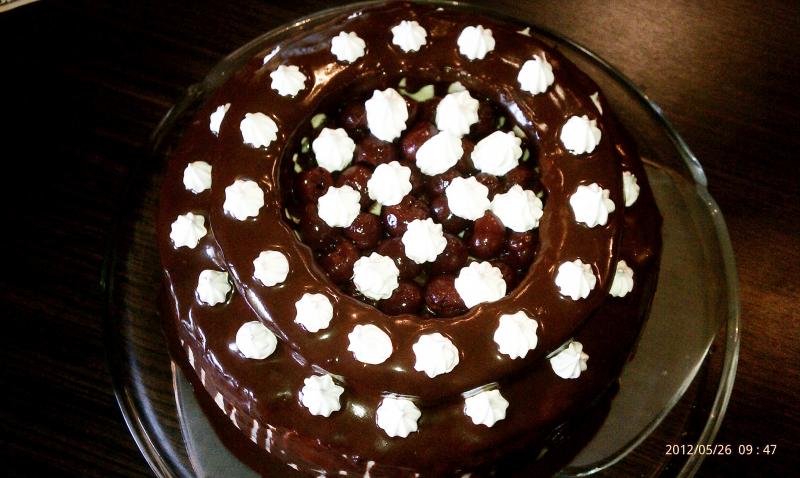 этот бисквит с вишнями(внутри тоже) с шоколадной глазурью из порошка какао........в разрезе нет, так как в подарок готовился как и следующий тортик....