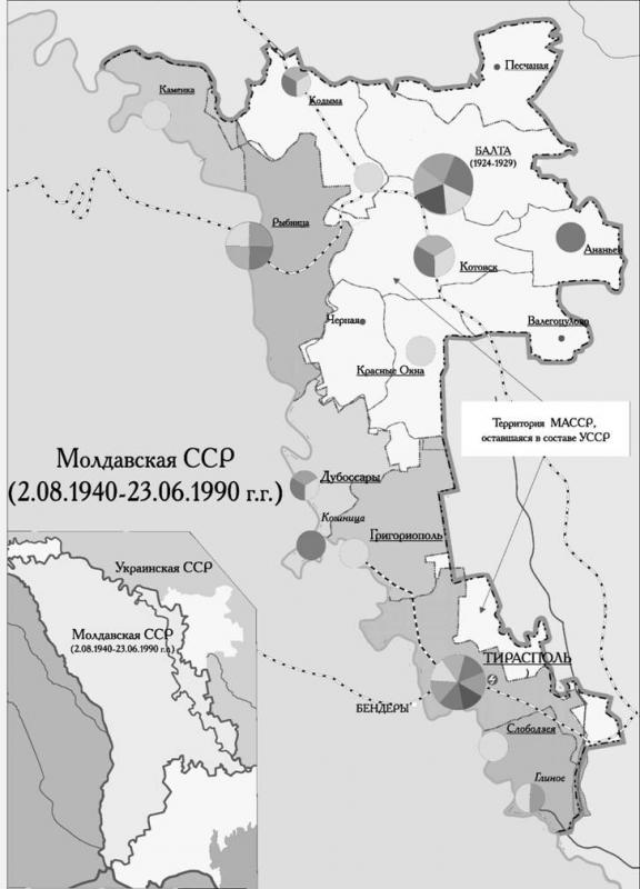 Приднестровье в составе МССР (1940 г.) После поражения Польши в сентябре 1939 года перед Румынией встал вопросом: с кем ей быть? Исходя из того, что Англия и Франция вряд ли вступятся за Румынию в сложившейся ситуации, Румыния, верная своей исторической роли «всегда быть слугой сильного хозяина», стала союзником фашисткой Германии. С конца 1939 года ею был взят курс на подготовку к войне. На территорию Румынии были переброшены воинские формирования германского вермахта, сначала как учебные части. 30 апреля 1940 г. в Румынии была объявлена мобилизация. С середины мая начата разработка военной операции по освобождению Бессарабии. 20 июня 1940 г. была подготовлена директива Генерального штаба РККА о готовности к началу военных действий по освобождению Бессарабии. 26 июня 1940 г. в 22 часа нарком иностранных де В. Молотов вручил румынскому посланнику Г. Давидеску Ноту советского правительства с требованием к Румынии освободить Бессарабию. Советско-германский договор 1939 года предусматривал, что стороны будут консультироваться о действиях в зонах совместных интересов. Однако Советское Правительство нотой от 26 июня 1940 года поставило Германию в тупик. Связанный договором о ненападении, Гитлер не смог воспрепятствовать действиям СССР против своего слабого союзника. Румыния же, не получив от немцев внятного ответа на просьбу о помощи 27 июня после второй ноты согласилась с требованиями СССР. В 11 часов 28 июня румынские войска начали отход из Бессарабии. В 12 часов части НКВД заняли мосты через Днестр, открыв путь частям 9 армии, начавшим движение от демаркационной линии на Днестре к Государственной границе СССР на р. Прут. 30 июня вся территория Бесарабии была взята под контроль Красной Армии. Исторически события лета 1940 года можно было бы трактовать как справедливый итог Первой мировой войны. К1940 году Советское государство вернулось в границы Российской империи, завершив собирание земель. Однако, этим же актом Приднестровье было использовано как разменная монета в большой политической игре. В августе 1940 года без референдума, без упразднения МАССР, без согласия органов власти МАССР, в нарушение Конституции Украины была создана Молдавская Советская Социалистическая Республика. Экономически более высокоразвитое Приднестровье на долгие годы стало экономическим донором для Молдавии. Между Приднестровьем и Бессарабией было больше отличий, чем общего. Существовавший в Приднестровье промышленный и сельскохозяйственный комплекс резко контрастировал с нищей, забитой, аграрной Бессарабией. В культурном, образовательном и научном плане это были не сопоставимые величины. Полностью грамотное население Приднестровья, имеющее четыре высших учебных заведения на 500 тысяч населения, и — полуграмотная Бессарабия, не имеющая ни одного ВУЗа, с архаичной слаборазвитой и недоступной для большей части населения системой образования. То же касалось и системы здравоохранения. События 1940 года нарушили поступательное развитие Приднестровья, как государственного образования. Из 14 районов шесть районов передали МССР, а восемь оставили Украине (а это 54,12% территории МАССР). Совершенно не были учтены этнические особенности Приднестровья, где молдавское население было меньшинством, а украинское и русское население составляло 61%. Почти 190 тысяч украинцев и русских от